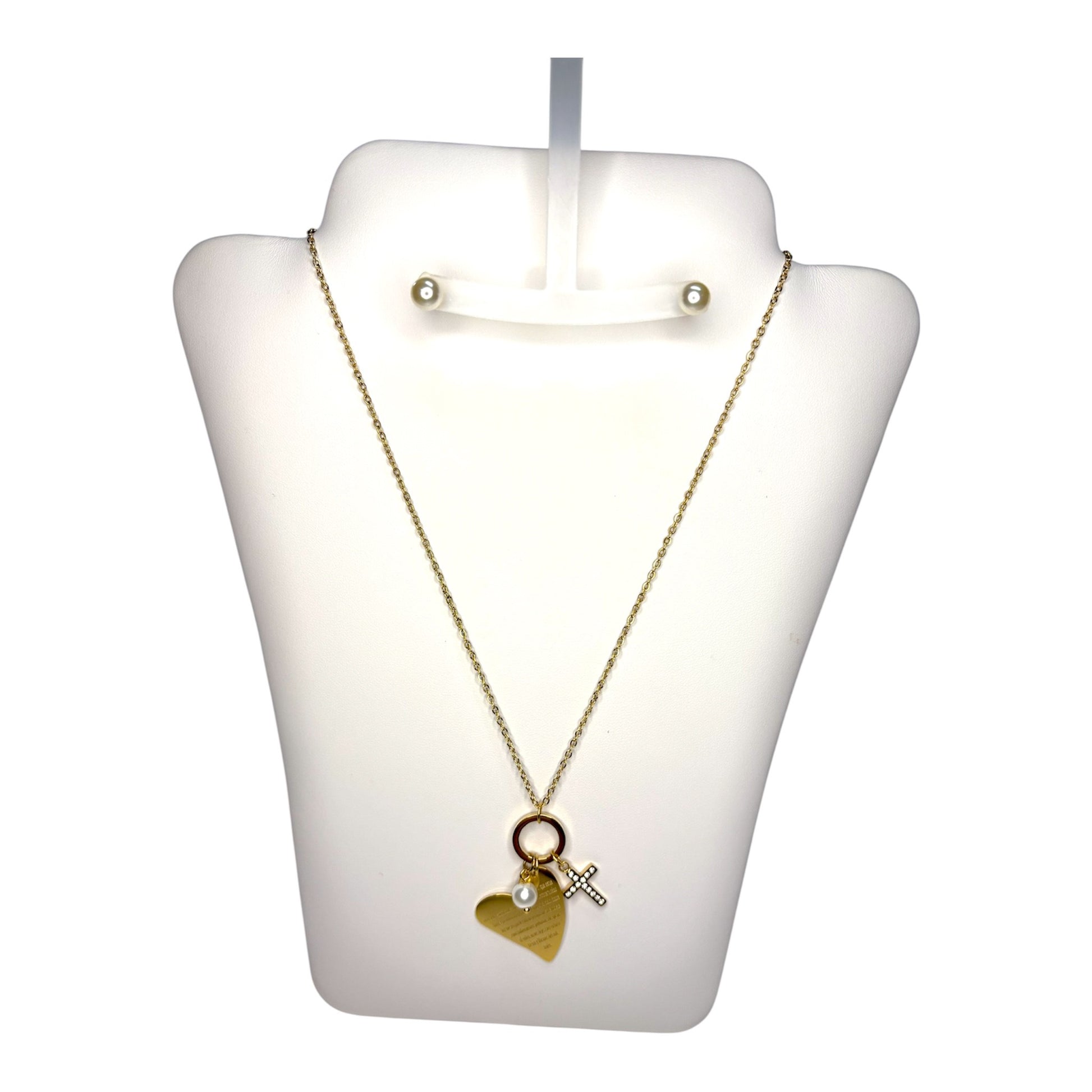 Cadena Dorada con Charms de Corazón, Cruz y Perla