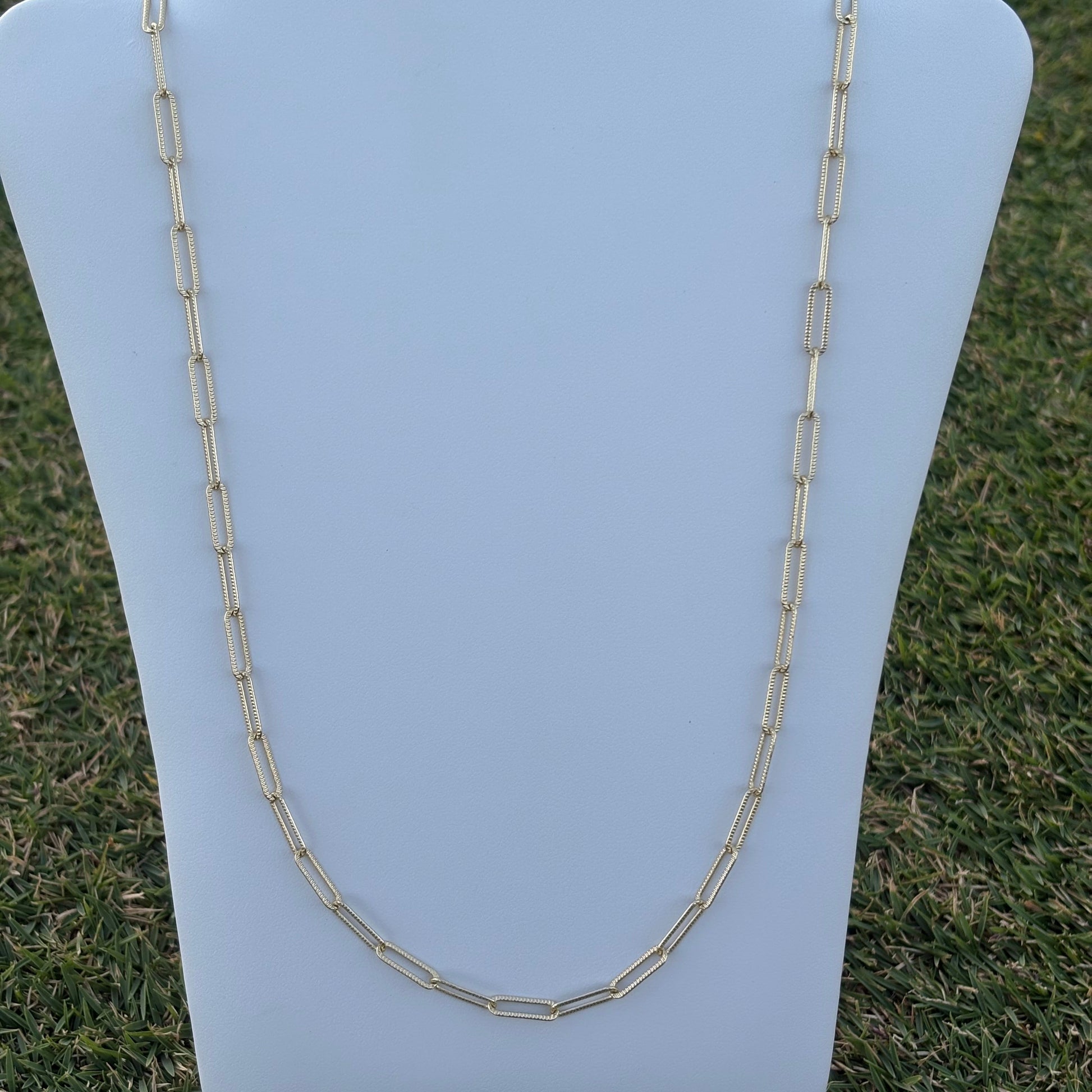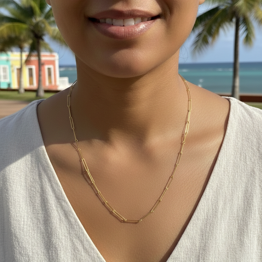 Cadena dorada de eslabones rectangulares con textura sutil que aporta un toque moderno y sofisticado a tu estilo. Perfecta para usar sola o en combinación con otras piezas. Su diseño atemporal la convierte en un básico versátil para cualquier ocasión. Fabricada en Stainless Steel, ofrece durabilidad y brillo que resiste el uso diario.