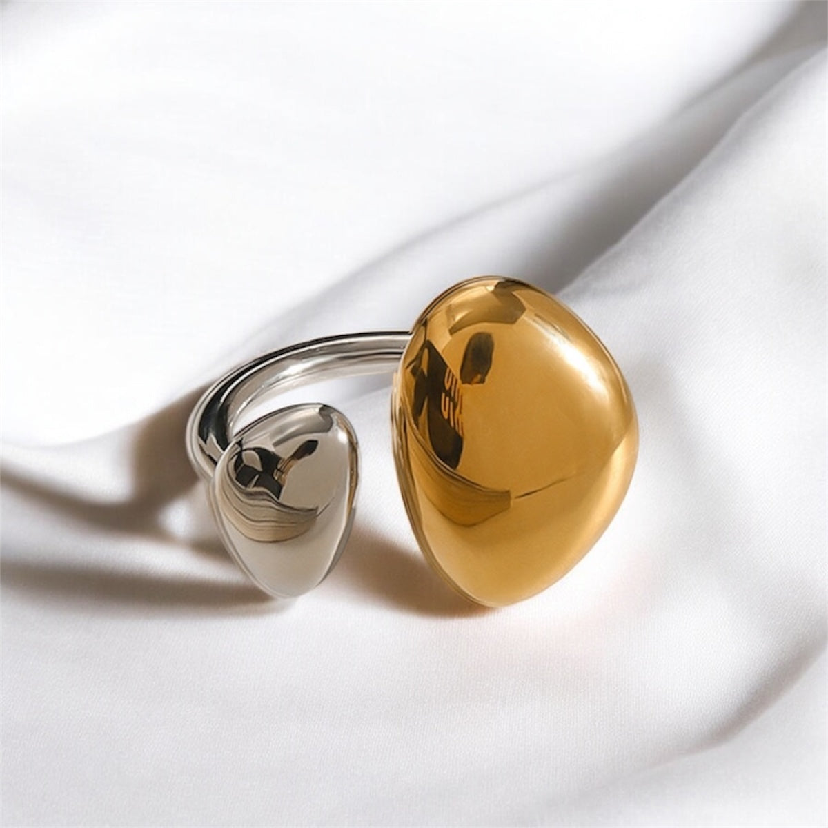 Este anillo bicolor es perfecto para quienes buscan una joya versátil que se adapte a diferentes estilos y ocasiones. Su diseño abierto lo hace cómodo y fácil de ajustar, permitiendo combinarlo con otros anillos o llevarlo como una pieza principal.