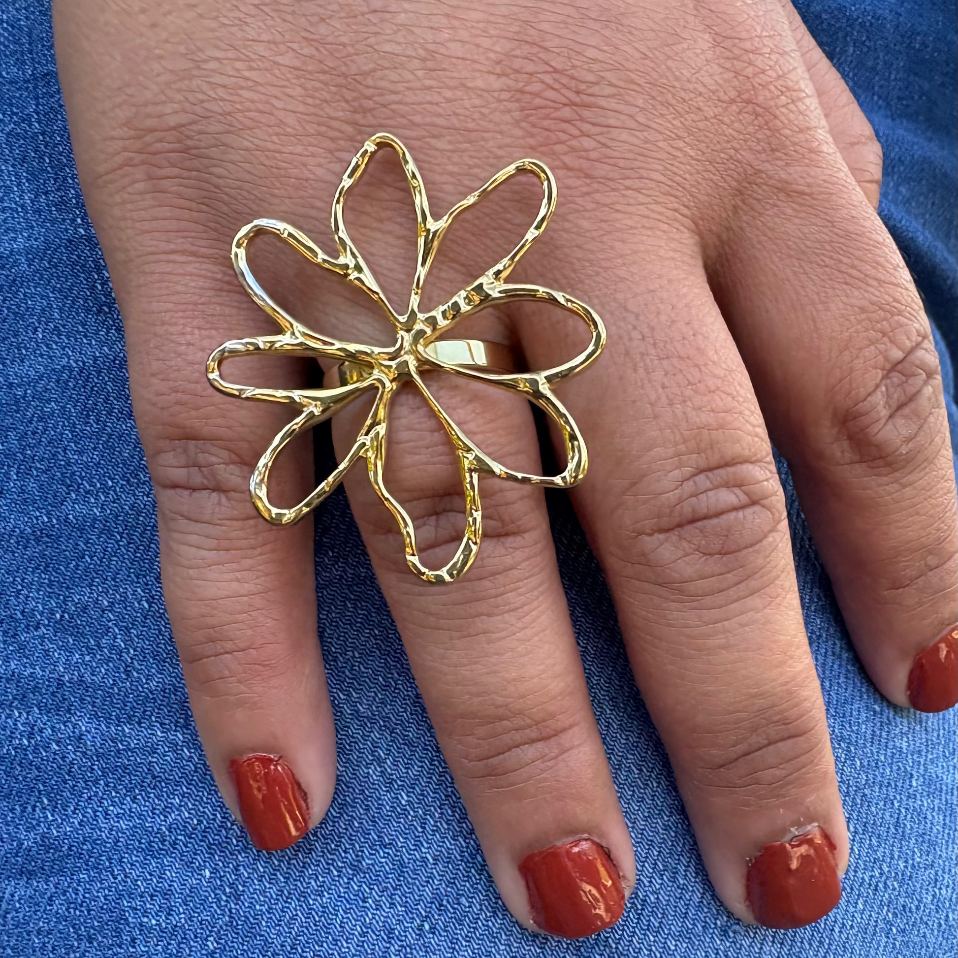 Esta sortija con forma de flor abierta es una declaración de estilo que no pasa desapercibida. Su diseño en acero inoxidable color dorado refleja luz desde todos los ángulos, añadiendo un toque atrevido y moderno a tu look. Perfecta para quienes aman destacar con piezas únicas y llenas de personalidad. Su estructura abierta permite ajustarla fácilmente al tamaño de tu dedo para un ajuste cómodo.